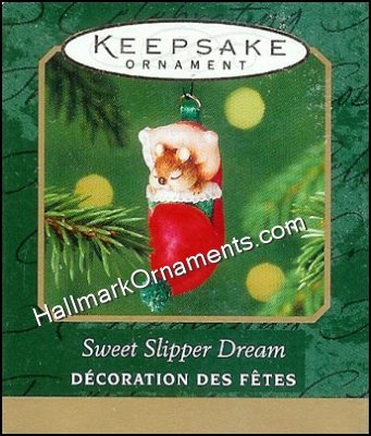 This Miniature Keepsake Ornament was originally produced and released by Hallmark in 2001. A mouse takes a nap in a holiday slipper.