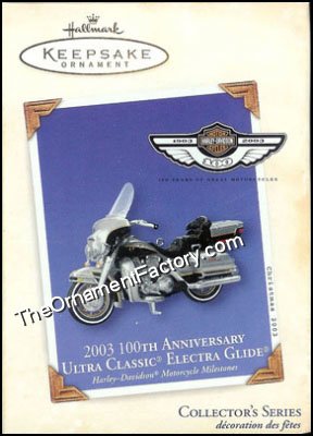 Since its introduction in 1965, the mighty Electra Glide has reigned supreme as the King of the Highway. For the 100th Anniversary of Harley-Davidson, the 2003 Ultra Classic Electra Glide takes touring comfort to new levels with its powerful Twin Cam 88 V-twin engine mated to a smooth 5-speed transmission. The Ultra features electronic cruise control, front and rear speakers, fairing and lowers, CB, intercom for rider and passenger, and spacious saddlebags and Tour Pak. With its striking Black and Sterling Silver paint, special anniversary badges, and gold cast wheels, the 2003 Ultra Classic Electra Glide ranks easily as one of the most beautiful motorcycles on the road.