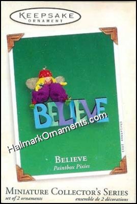 This 2003 Hallmark Keepsake Miniature ornament set of 2 features a cute little pixie elf ornament and an ornament that is the word BELIEVE.