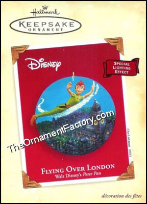 A scene with london u the background is feathured in this Hallmark Keepsake Ornament as Peter Pan is flying over the city. A miniature bulb from a miniature string of lights attaches to the rear of the ornament to illuminate the ornament. Size: 3″ H