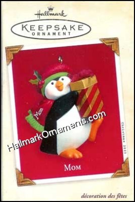 This 2003 Hallmark Ornament is a penguin holding a gift, wearing a red scarf that reads “Mom”