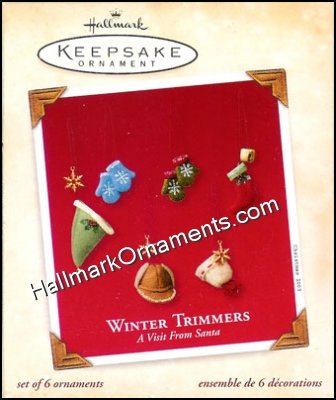 This set of winter trimmers features two hats, two mittens, and two stockings. The felt ornaments are accented with jingle bell and snowflake attachments.