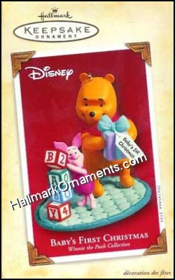 2004 Baby’s First Christmas Winnie the Pooh Collection. Piglet has stacked some blocks that read “2004” on one side, and “BABY” on another side. The purple and blue gift that Pooh is holding has a tag that reads “Baby’s 1st Christmas” Based on the “Winnie the Pooh” works by A.A. Milne and E.H. Shepard.