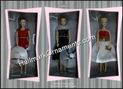 Set of 3 Barbie™ figurines. Handcrafted and fabric. After Five™ (1962-1964), Silken Flame™ (1962-1964), Sheath Sensation™ (1961-1964). Jointed arms, legs, and head. Display stands included.