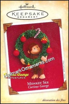Curious George is featured in this 2004 Hallmark Keepsake, holding a holiday wreath decorated with red bulbs and a candy cane.