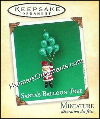 Santa’s legs dangle as he hangs from 6 green balloons. Miniature ornament.