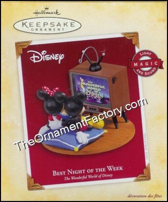 It must be Wednesday night because Mickey and Minnie are watching there favorite show, ‘THe Wonderful World of Disney.” This Hallmark Keepsake Ornament requires 3 LR44 batteries to operate the sound and light. Size: 4¼” H