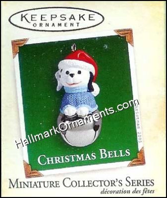 Christmas Bells – 11th & Final in the series. A puppy in a sweater wearing a Santa hat is on the last miniature jingle bell in this series. This Keepsake Ornament was originally produced and released by Hallmark in 2005.