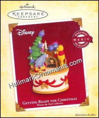 Getting ready for Christmas is a Hallmark Keepsake Ornament depicting Winnie the Pooh and his friends decorating for the hoidays. This Ornament has Pooh’s chair rocking as he attempts to hand a stocking on the mantle. Eeyore’s wagon moves to and fro and Tigger hides in the fireplace. This ornament plays “Deck the Halls.” Artist: N/A