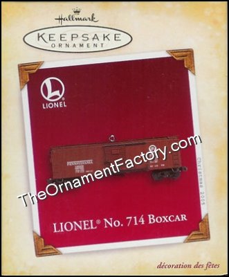 This Keepsake Ornament is based on the Lionel No. 714 Boxcar that was part of the innovative Lionel Outfit No. 705. Doors and both sides of the boxcar slid open.