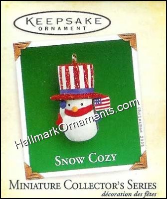 Snow Cozy – 4th & Final in the series. A patriotic penguin is the final installment in this miniature series. This Keepsake Ornament was originally produced and released by Hallmark in 2005.