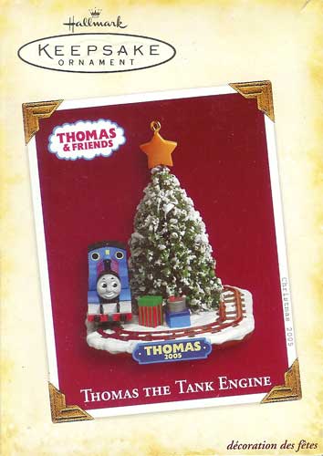 This 2005 Hallmark Keepsake Christmas Ornament features Thomas the Tank Engine on tracks next to a Christmas tree.