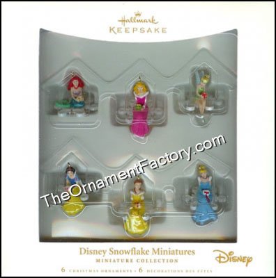 This Hallmark Keepsake Miniature Ornament set has six Disney female characters- Snow White, Cinderella, Belle, Ariel, Tinker Belle, and Aurora. This set was reeased in 2006. Size: Approx 1″ H each