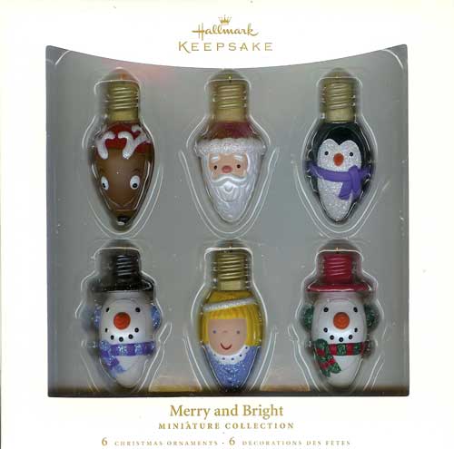 This set of 2006 Hallmark Miniature ornaments features pieces that have been crafted in the form of traditional Christmas tree light bulbs, with the faces of some very familiar traditional holiday characters.