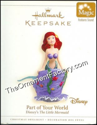 Ariel is looking for Prince Eric in the Hallmark Keepsake Ornament. This ornament requires 3 LR 44 batteries as Ariel tellsus about Prince Eric. Artist: Katrina Bricker
