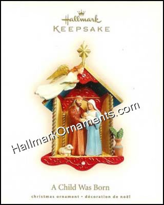 Mary and Joseph look upon the baby Jesus as an angel flies overhead.