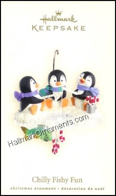 Three penguin friends try to catch fish with candy canes. This Keepsake Ornament was originally produced and released by Hallmark in 2007.