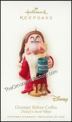 Grumpy, one of Snow White’s Seven Dwarfs, is hoding his coffee. Grumpy has on a red nightshirt and bunny slippers and a very grumpy expression. This Hallmark Keepsake Ornament was released in 2007. Artist: John “Collin” Francis