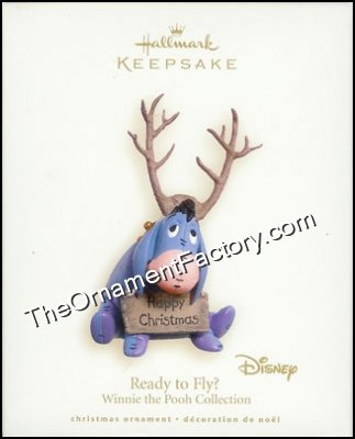 Pooh forlorn Eeyore! He just is not able to fly even though he is wearing antlers but he does wish everyone a “Happy Christmas” by wearing a sign around his neck. This Hallmark Keepsake Ornament was released in 2007. Artist: Robert Hurlburt