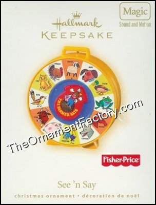 A childhood classic toy, the See N Say, made by Fisher Price is a 2007 Hallmark Keepsake ornament. Pull on the string and hear the authentic sounds of education. Uses 3 LR44 batteries