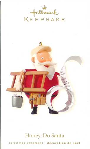 Mrs. Claus seems to be keeping Santa rather busy with her honey-do list, as Santa has a tool belt, ladder, bucket, and a VERY long list of chores to complete in this 2008 Hallmark Keepsake ornament.