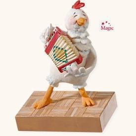 Press the button on the base of the ornament to hear music from The Hit Crew’s classic “The Chicken Dance.”