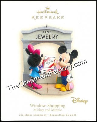 Minnie is looking through the window of a jewlery store where a sale is in progress as mickey looks forlornly at her. This Hallmark Keepsake Ornament was released in 2008. Artist: Robert Hurlburt Size: 3 1/2″ H