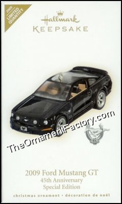 This Hallmark Keepsake Limited Edition ornament features a Ford Mustang GT. This ornament celebrates the 45th anniversary of the Mustang GT. The back license plate is dated 2009.