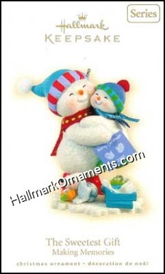 A snowmom and her child share a hug after her child gave his mom a Christmas present and card. The card reads: “Merry Christmas 2009″, and has a couple of snowboy hand prints on it.   Note: The product code used on this ornament was also used in 2001