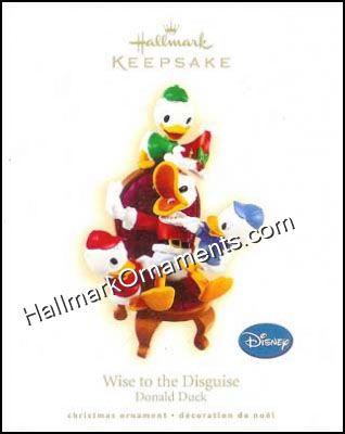 Who can fool Huey, Dewey and Louie? Not Donald! Donald is wearing a Santa suit and beard but his nephews are not fooled in this 2009 Hallmark Keepsake Ornament.
