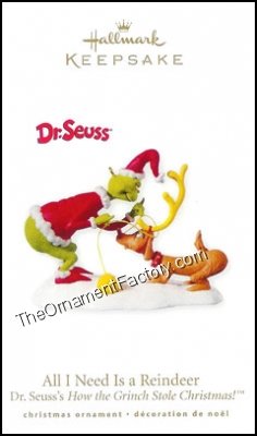 The Grinch dressed as “Santy” and his trusty dog, Max, dressed as a reindeer ready to steal Christmas from the classic story How the Grinch Stole Christmas makes up this 2010 Hallmark Keepsake ornament.