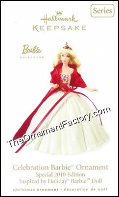 Barbie never goes out to a holiday party without going all out. For 2010, the festive fashionista mixes, mingles, and dazzles in a classic floor-length gown featuring a full skirt of pure snowy white. Its strapless bodice includes accents of eye-catching red echoed by a bow at the hip and an elegant shoulder wrap stretching all the way to the floor. A sparkling tiara adds the crowning touch, completing a fashion statement that only Barbie could make!