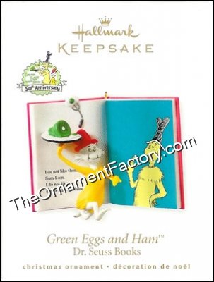 This 2010 Hallmark Keepsake ornament, Green Eggs and Ham, comes from the classc story by Dr. Seuss, Green Eggs and Ham. The book has a pop out of green ham on a platter.
