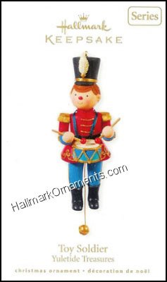 This 2010 Hallmark ornament is a classic toy soldier. When you pull the string, he will play his drum. (no sound)