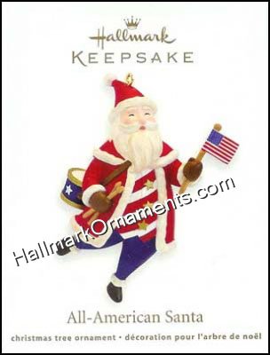 This 2011 Hallmark Keepsake ornament features a very patriotic Santa, dressed in red, white and blue. He is holding an American flag in his left hand, and has a drum strapped on his back.