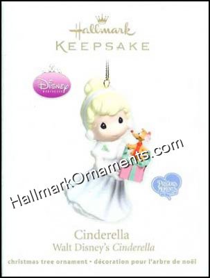 Cinderella is captured in this Hallmark Precious Moments Keepsake Ornament. Cinderella is holding a Christmas gift with one of her mouse friends on top. This Hallmark Ornament is made of porcelain and was released in 2011.