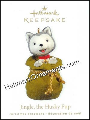 Husky, the Frosy Friends’ little pup, is featured in this 2011 Hallmark Keepsake Ornament. This frisky pup has managed to get inside of a little brown cloth bag, which ties at the top with a satin rope.