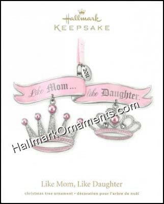 Two crowns (a queen’s crown and a princess’s crown) are held together by a pink ribbon that reads: “Like Mom, Like Daughter”