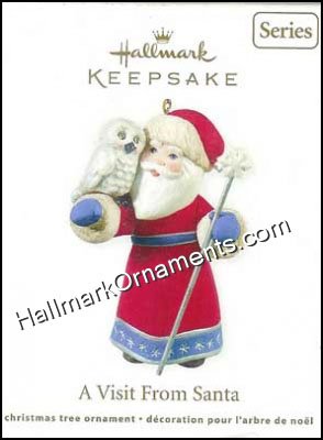 This 2011 Hallmark Keepsake ornament is #3 in the Visit From Santa Hallmark Ornament series. Santa is holding a staff topped with a star in his left hand, with a white owl perched on his right arm.