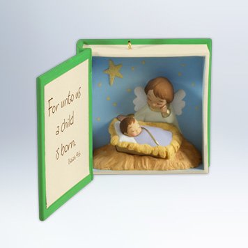 This 2012 Hallmark KeepsakeĀ makesĀ a promise of hope for all the world. See Jesus nestled in the cradle as he’s visited from an angel in this ornament featuring words from Isaiah 9:6.