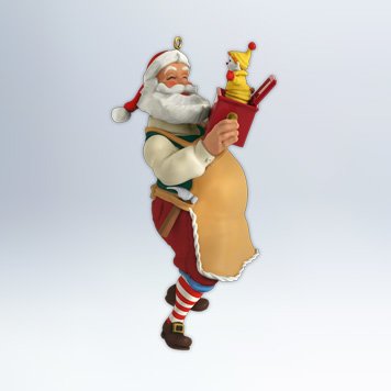 What special project has Santa taken on this year? For the #13 ornament in the Toymaker Santa series, we peer into the Santa’s workshop and see him tinkering around with a jack-in-the-box toy.