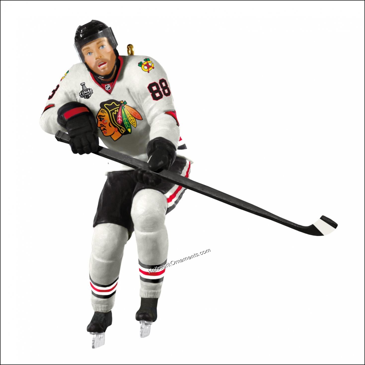 This 2013 Hallmark ornament is an updated “repaint” of the 2010 Patrick Kane. Specially released in 2013 for all NHL fans, this ornament depicts Kane wearing his Blackhawks jersey (and playoff beard) when he led the Blackhawks to the Stanley Cup.