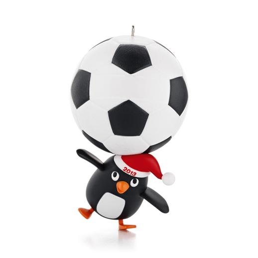 If your goal is to score major points with an ornament that goes to your soccer player’s head, then this penguin with the personalized soccer ball is for you. This 2013 soccer-themed ornament comes with stickers to help you put your sport player’s name right on the ball.