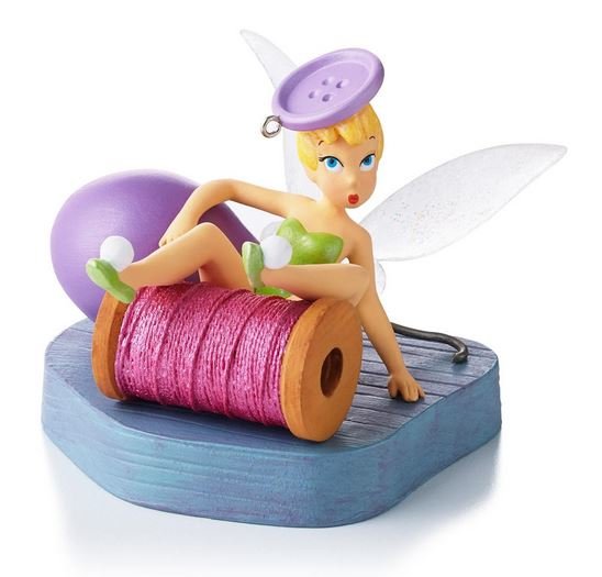 Sometimes being tiny has its drawbacks. Tinker Bell stumbles over a spool of thread and ends up on the floor with a button on her head. This Hallmark Ornament was released in 2013.