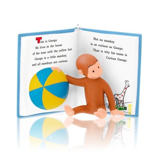 Curious George Flies a Kite On ornament: This is George. He lives in the house of the man with the yellow hat. George is a little monkey, and all monkeys are curious. But no monkey is as curious as George. That is why his name is Curious George. This is from the Curious George book series.