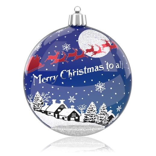 Santa is in his sleigh and flying over some houses on Christmas Eve. This ornament is made of glass. Written on the ornament: Merry Christmas to all!