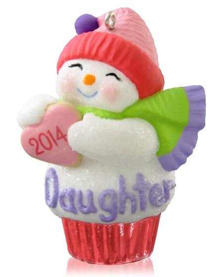 This Daughter snow-woman is wearing a pink hat and is holding a heart shaped sugar cookie dated 2014
