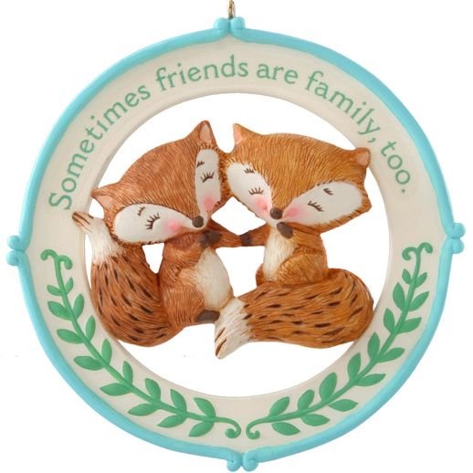 This 2014 Hallmark Keepsake Ornament is a Hallmark Gold Crown Exclusive. Two friendly foxes in a circle with the words, “Sometimes friends are family too.”