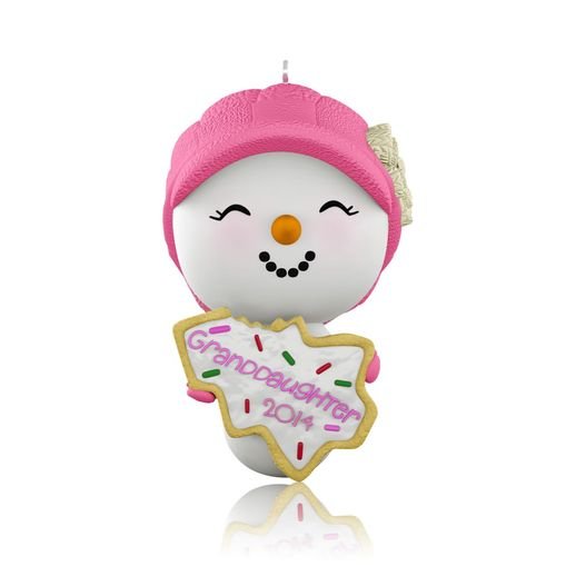 A snowgirl with a bright pink hat and a Christmas tree shaped cookie with Granddaughter 2014 on the hat. Artist: Orville Wilson