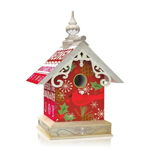 This 2014 Hallmark Keepsake Ornament is a Hallmark Gold Crown Exclusive. A red birdhouse with a cardinal painted on the front and written on the side is, “Heaven and nature sing.”